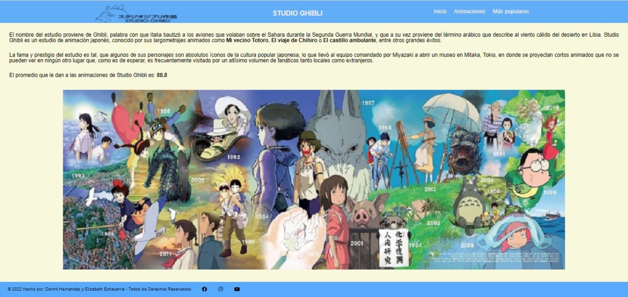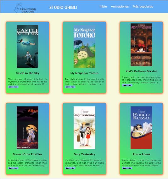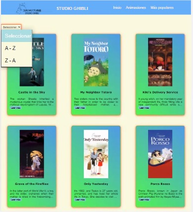 Studio Ghibli permite que sus usuarios visualicen de manera clara y sencilla una breve introducción de su trayectoria, el promedio que han recibido sus animaciones, también muestra en forma de tarjetas cada una de las animaciones con su descripción, en donde el usuario puede ordenar las animaciones por el titulo de forma ascendente y descendente, además de filtrar las animaciones por las más populares o las más vistas por los usuarios.