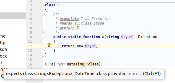 $a = instantiator(Foo::class); // Psalm knows the result is an object of type Foo- Inspections for not given wrong parameter