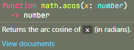 ---[View documents](command:extension.lua.doc?["en-us/51/manual.html/pdf-math.acos"])executes a VS Code command that then launches a webview that shows the locally stored documentation.It does not allow for anyone to link to documentation that lives elsewhere. This is a good thing though as it could open some serious security holes.