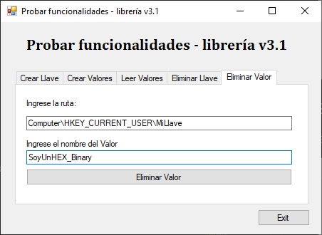 NOTA: Ésta funcionalidad solo eliminará un valor, si desea eliminar todos los valores dentro de una llave, usted puede usar la función anterior "Eliminar Llave".