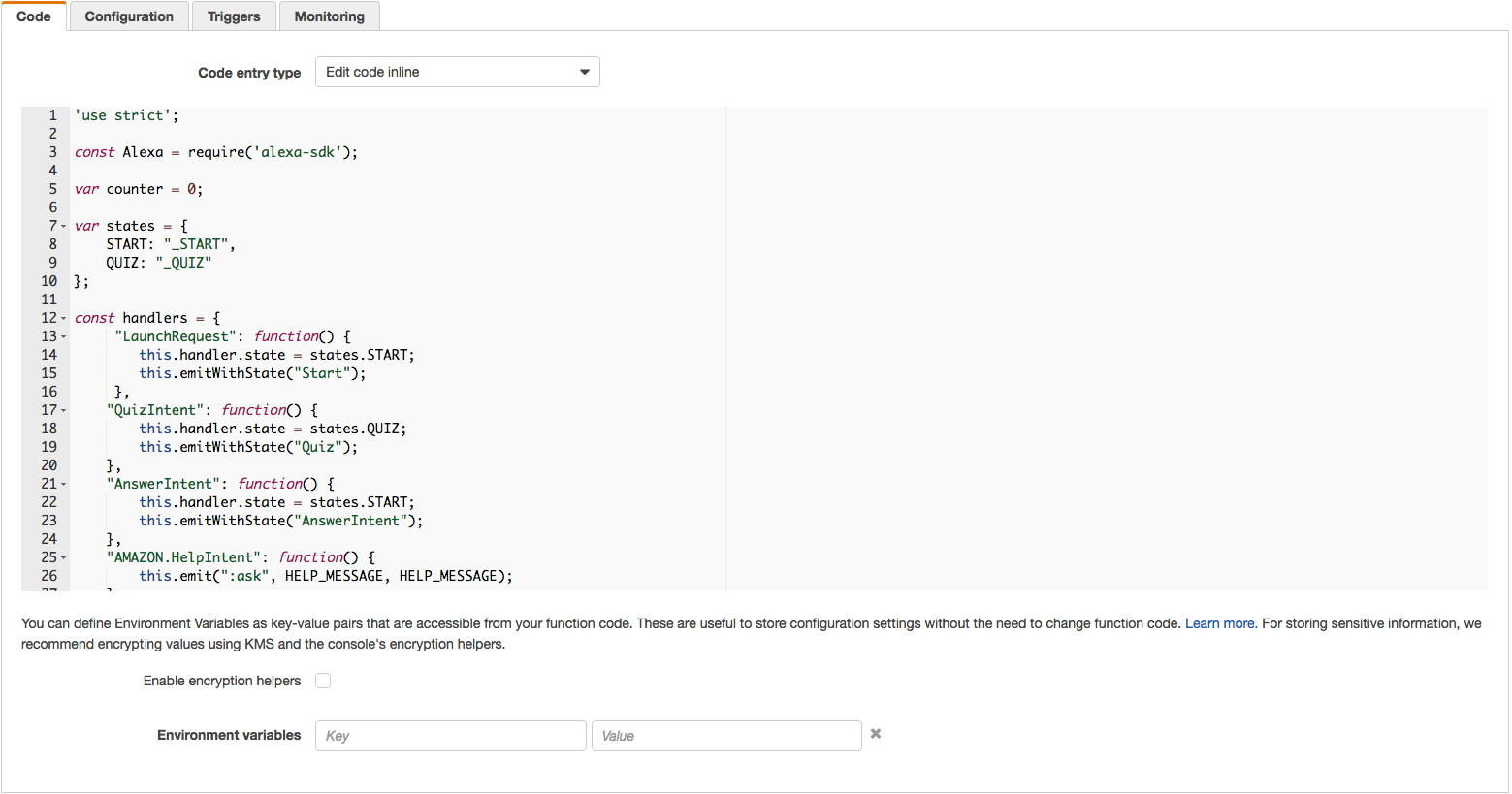 When you have replaced the placeholders in index_template.js, copy the contents of your file to your Lambda function. This should be as simple as copying the text, and pasting it into the code box for your Lambda.