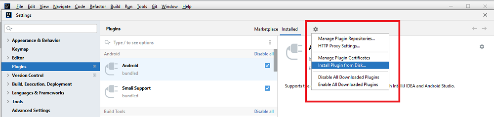 - Select Plugins, click the gear icon and then Install Plugin from Disk.