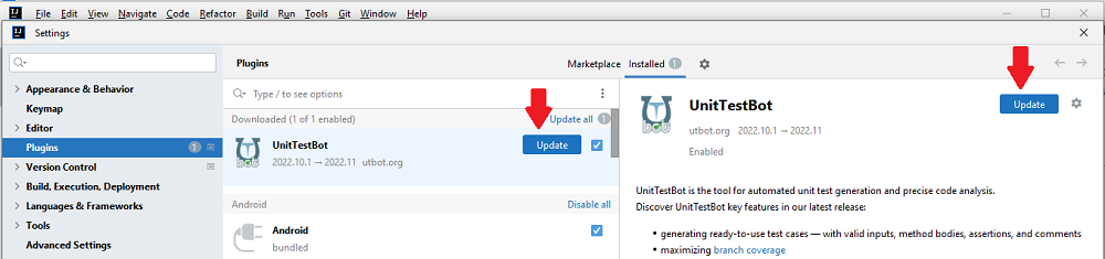 To check if UnitTestBot is enabled, go to File > Settings > Plugins and choose Installed.