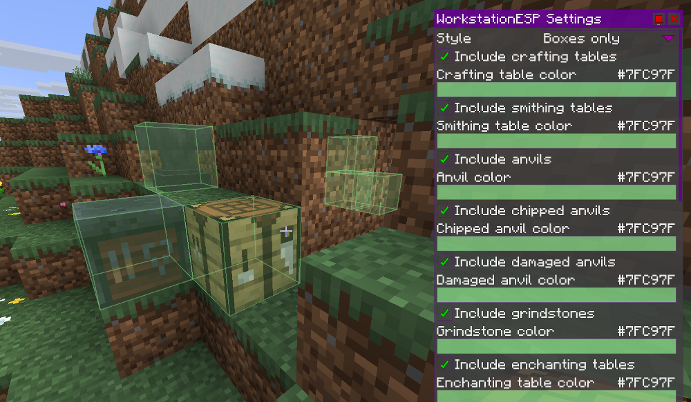 - Highlights crafting/workstation blocks: Crafting Table, Smithing Table, Anvil, Grindstone, Enchanting Table, Cartography Table, Stonecutter, Loom, Furnace, Blast Furnace, Smoker, Campfire, Soul Campfire, Brewing Stand, Cauldron, Barrel, Composter, Lectern, Fletching Table, Beacon.