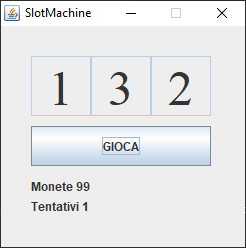 Semplice Slot Machine in Java con interfaccia grafica. Ogni volta che il tasto "GIOCA" viene premuto vengono generati 3 numeri casuali, il giocatore parte con 100 monete, ogni giocata costa 1 moneta, se 2 su 3 numeri sono uguali il giocatore guadagna 3 monete, se tutti e 3 i numeri sono uguali il giocatore fa jackpot e il gioco finisce. Se il giocatore non ha più monete finisce il gioco.