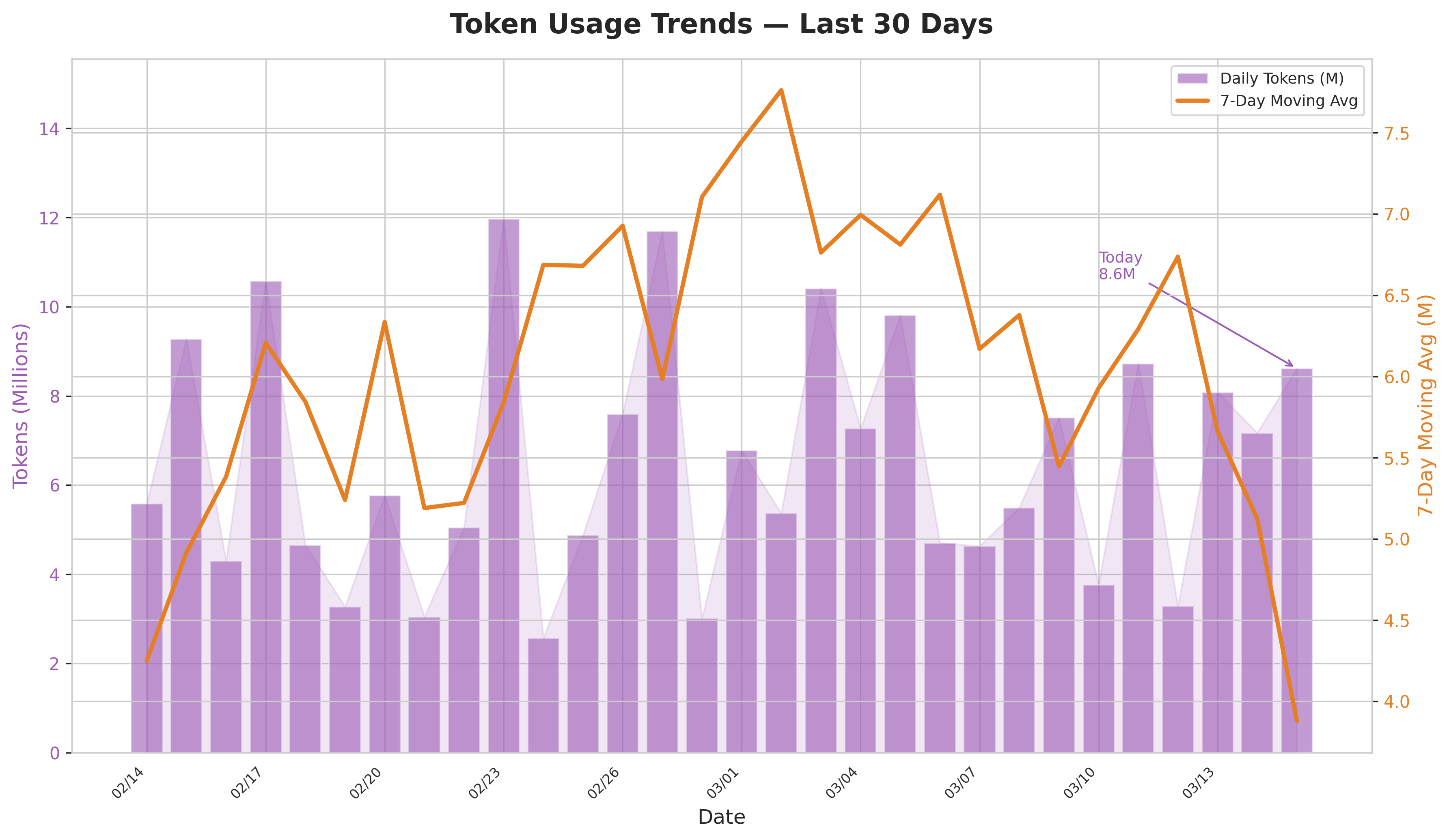 Today's 8.6M tokens is driven primarily by Chroma Issue Indexer (4.26M), Copilot PR Prompt Pattern Analysis (1.83M), and Contribution Check (1.45M). Cost tracking unavailable (no billing data in run metadata).