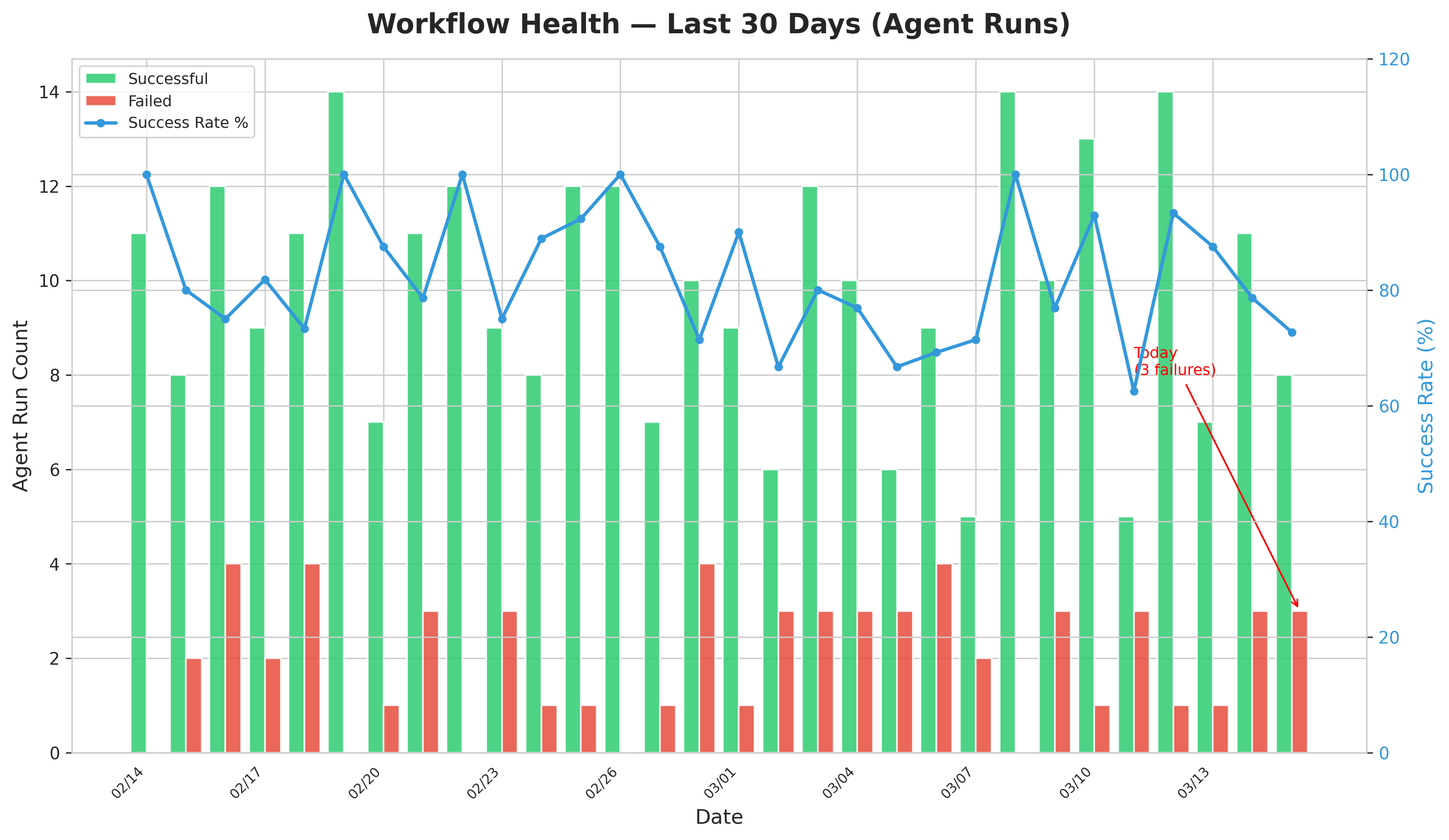 Today saw 3 failures against 8 successes (72.7% success rate for agent runs). The bulk of runs are event-triggered skips (slash commands, issue/PR reactions not matching), which is expected behavior.
