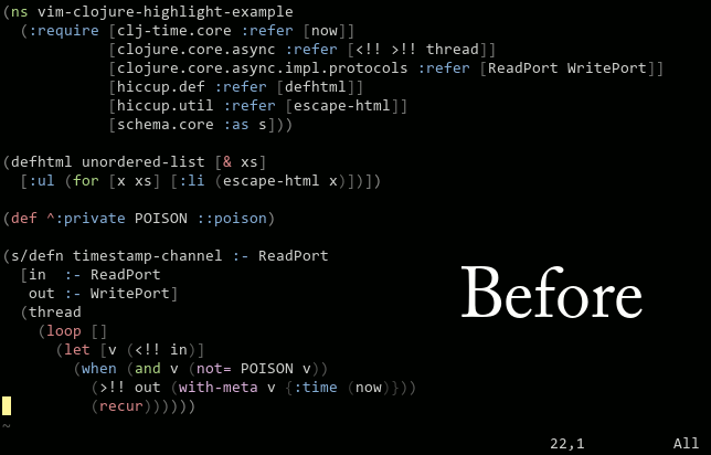 autocmd BufRead *.clj try | silent! Require | catch /^Fireplace/ | endtrySince vim-clojure-highlight dynamically alters the syntax state of a buffer, it's possible that other syntax extensions will be affected by this plugin.