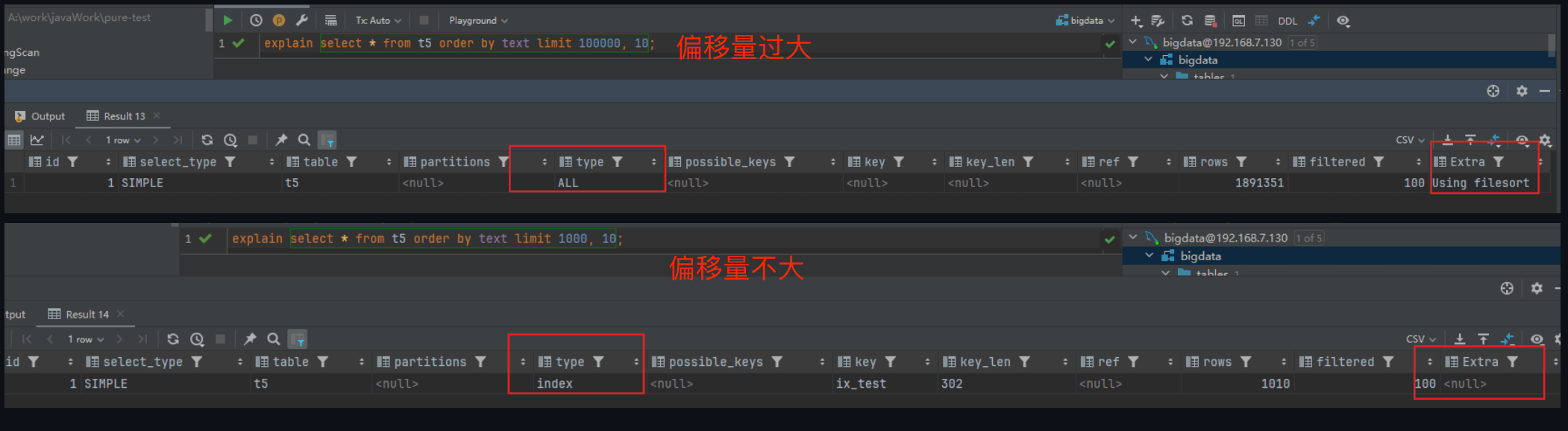 不同机器上这个查询偏移量过大的临界点可能不同,取决于多个因素,包括硬件配置(如 CPU 性能、磁盘速度)、表的大小、索引的类型和统计信息等。