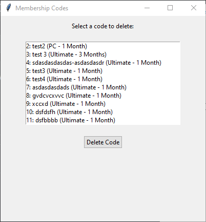 An open-source Python program to store and manage Xbox Game Pass membership codes in an SQLite database. The program uses Tkinter to create a graphical user interface (GUI) to enter and display codes. The program uses an SQLite database to store the codes, allowing the user to delete codes from the database. The program also includes a radio button group to select the code type and the membership length.