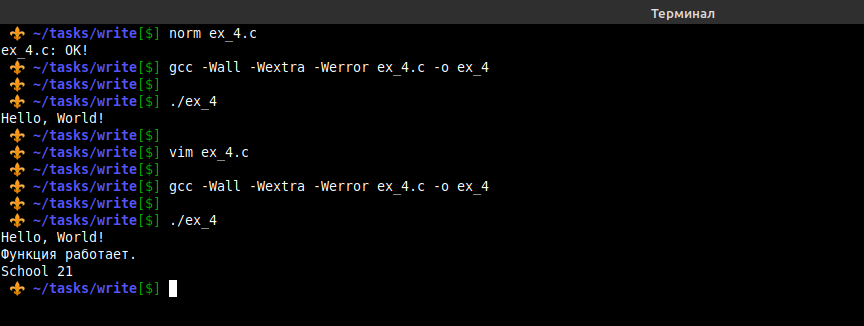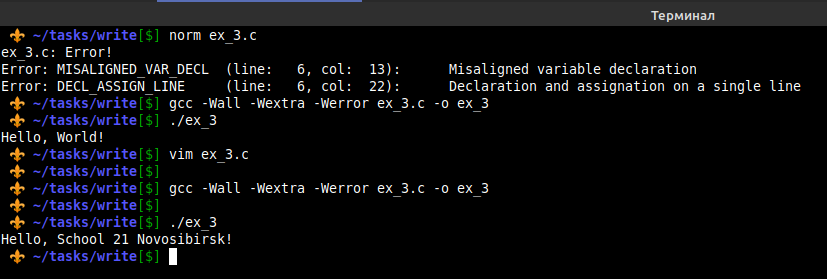 В первом примере выше я не показал, как запускать проверку norminette и компилировать код, но это можно увидеть в этом примере. Видно, что код написан по стандарту, и в результате его выполнения получаем в выводе Hello, World!. Да, теперь мой терминал выглядит так. Если будет интересно узнать, как я сменил стиль bash-оболочки, могу позже об этом написать статью.