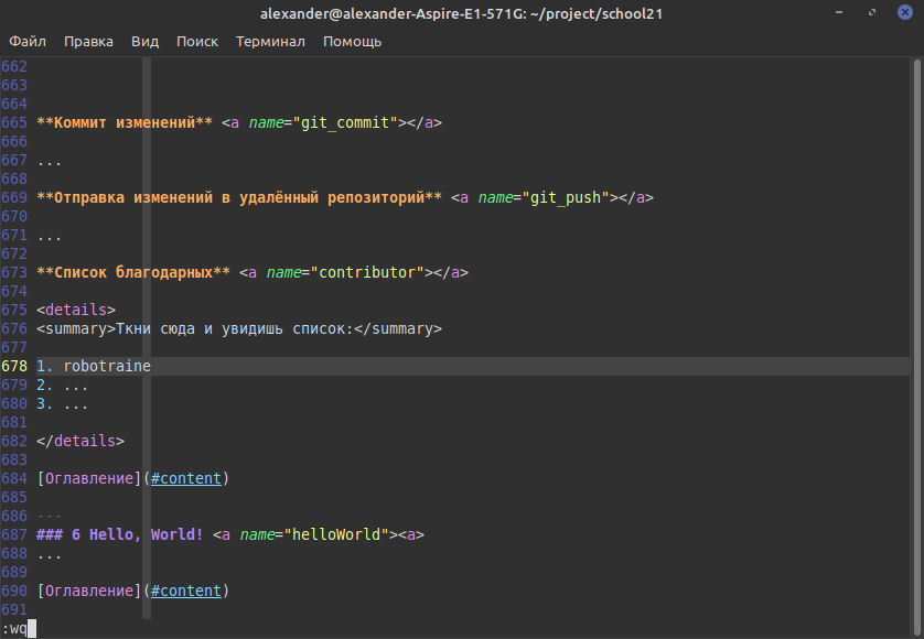 Затем вводим команду :wq - сохраняем и закрываем vim. Теперь нам необходимо проиндексироваь изменения файла в git. Для этого вводим следующую команду в терминал: