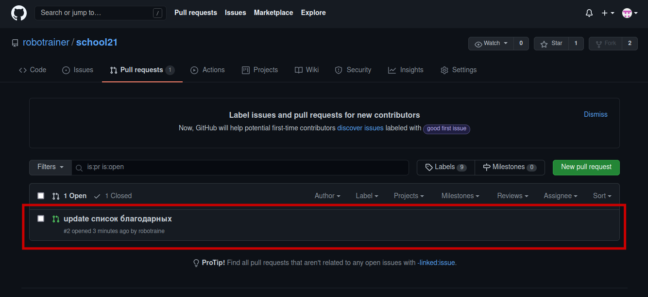 Давайте посомтрим, какие нужно сделать действия владельцу оснвной ветки для принятия предложенных вами изменений. Владелец основной ветки, зайдя на страничку своего репозитория, видит, что появился новый Pull requests. Нажав на эту вкадку, он увидит предложенный коммит другим пользователем GitHub.