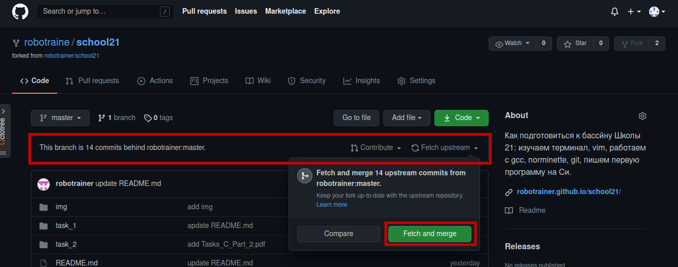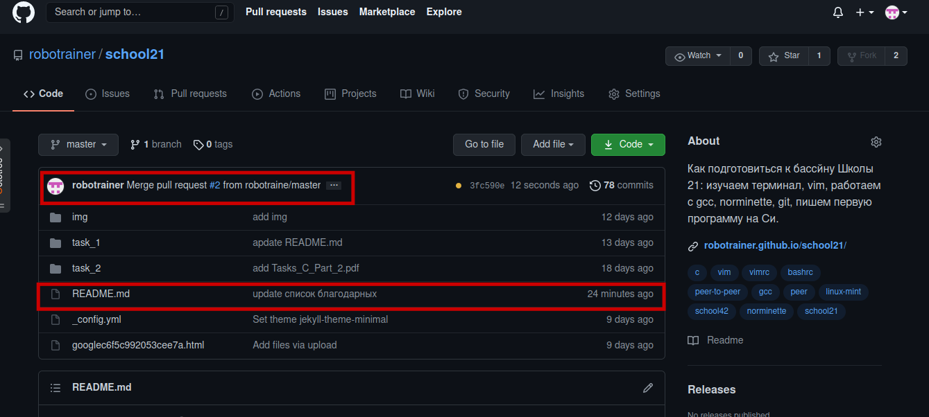 После этого, перейдя на основную страницу репозитория, владелиц основной ветки увидит надпись о слиянии с веткой от другого пользователя и коммит напротив изменённого файла. Исследовав изменённый файл README.md, можно найти новые добавленные строчки.