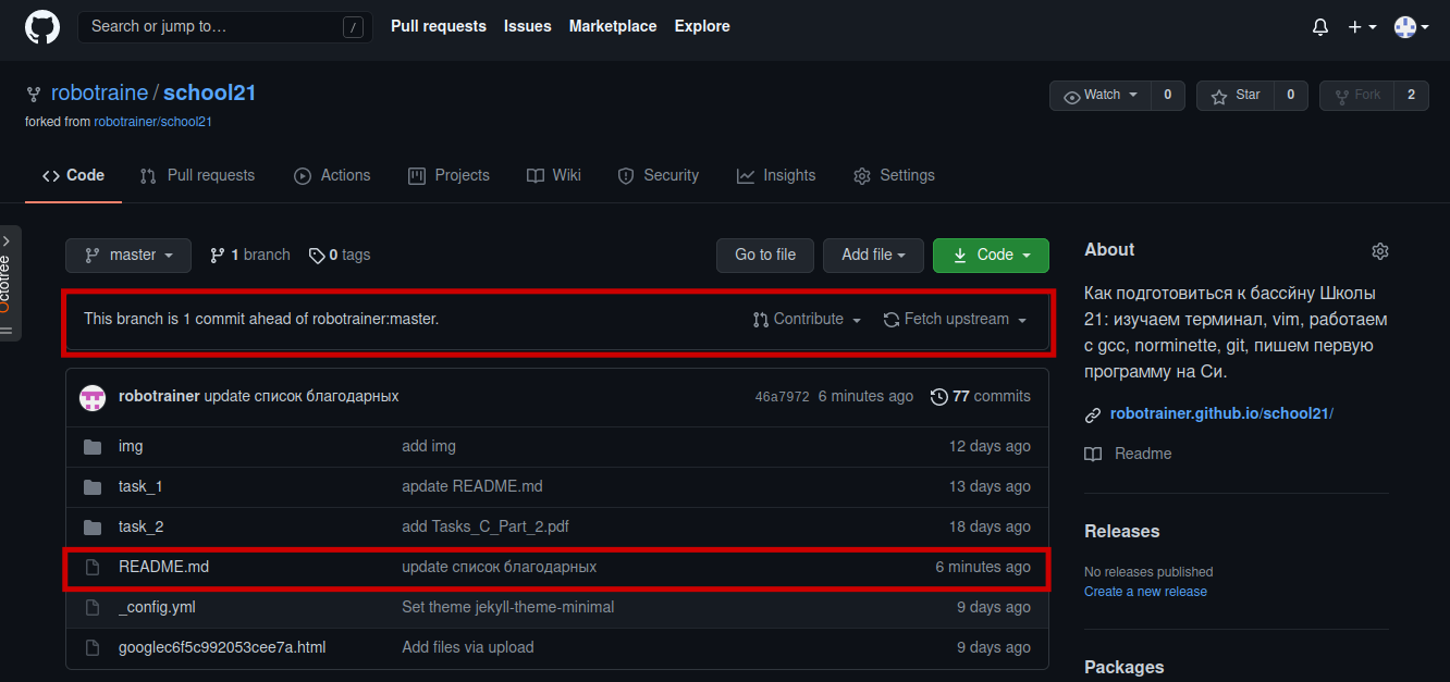 Когда вы откроете свою ветку репозитория на GitHub, то увидете, что там появилась строча о том, что ваша ветка опережает основную ветку репозитория другого человека на 1 коммит. Напротив редактированного файла README.md появится ваш комметарий к коммиту.