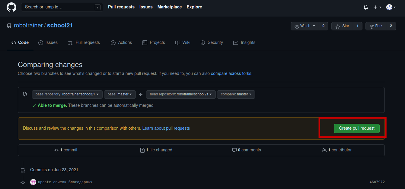 Откроется страница сравнения изменений на которой необходимо нажать на кнопку Create pull request. Таким образом вы создаёте запрос на втягивание изменений с вашей ветки в ветку репозитория другого человека.