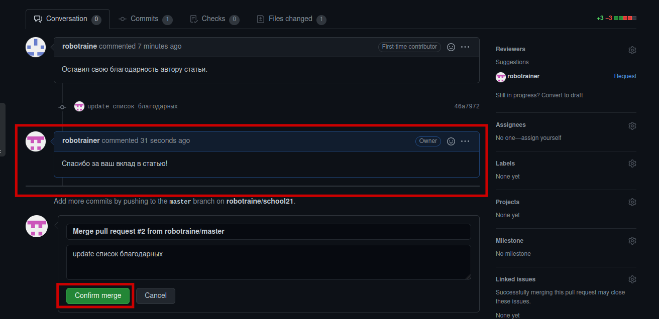 Нажав на этот коммит, откроется страница с формой комментария коммита, в которой можно оставить благодарность за вклад или другие любые коментарии, касающиеся коммита. Если предложенные изменения устраивают владельца основной ветки, он может нажать на кнопку Merge pull request.