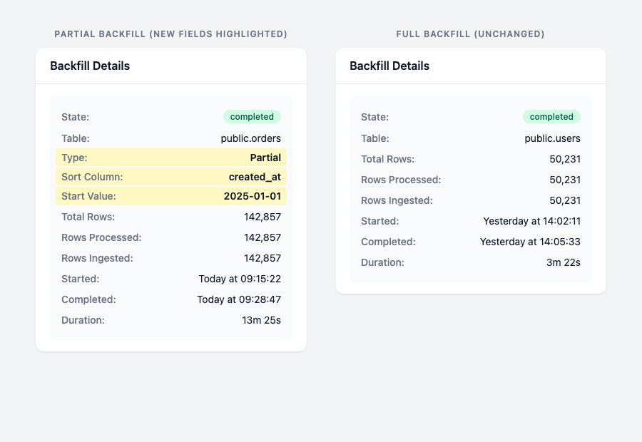 The three highlighted rows (Type, Sort Column, Start Value) only appear for partial backfills. Full backfills are unchanged.