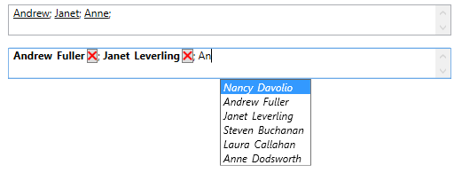 Represents a textbox control that lets you edit and display a series of values as tokens. If an ItemsSource is specified, an AutoComplete popup will appear with a filtered list of valid values during editing.
